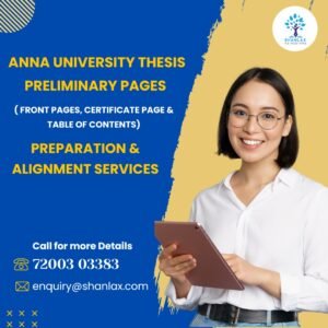 Shanlax Research provides specialized services designed to ensure that the presentation and alignment of preliminary thesis pages for Anna University students meet the highest academic standards. These crucial pages, which include the title page, acknowledgements, abstract, and table of contents, set the tone for the thesis and contribute to a first impression that can impact the reader’s perception of the work. Shanlax Research ensures that every element—from font size to header alignment—is meticulously formatted according to Anna University’s guidelines. Additionally, they offer aesthetic advice on layout that not only aligns with the university’s requirements but also enhances the overall readability and professionalism of the thesis.