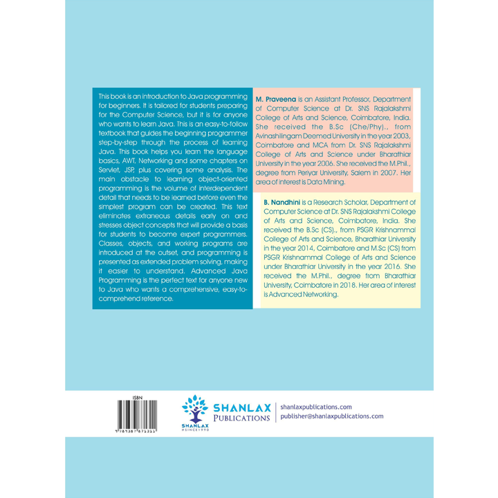 ❋ Earn 22 points from this purchaseThis book is an introduction to Java programming for beginners. It is tailored for students preparing for the Computer Science, but it is for anyone who wants to learn Java. This is an easy-to-follow textbook that guides the beginning programmer step-by-step through the process of learning Java. This book helps you learn the language basics, AWT, Networking and some chapters on Servlet, JSP, plus covering some analysis.